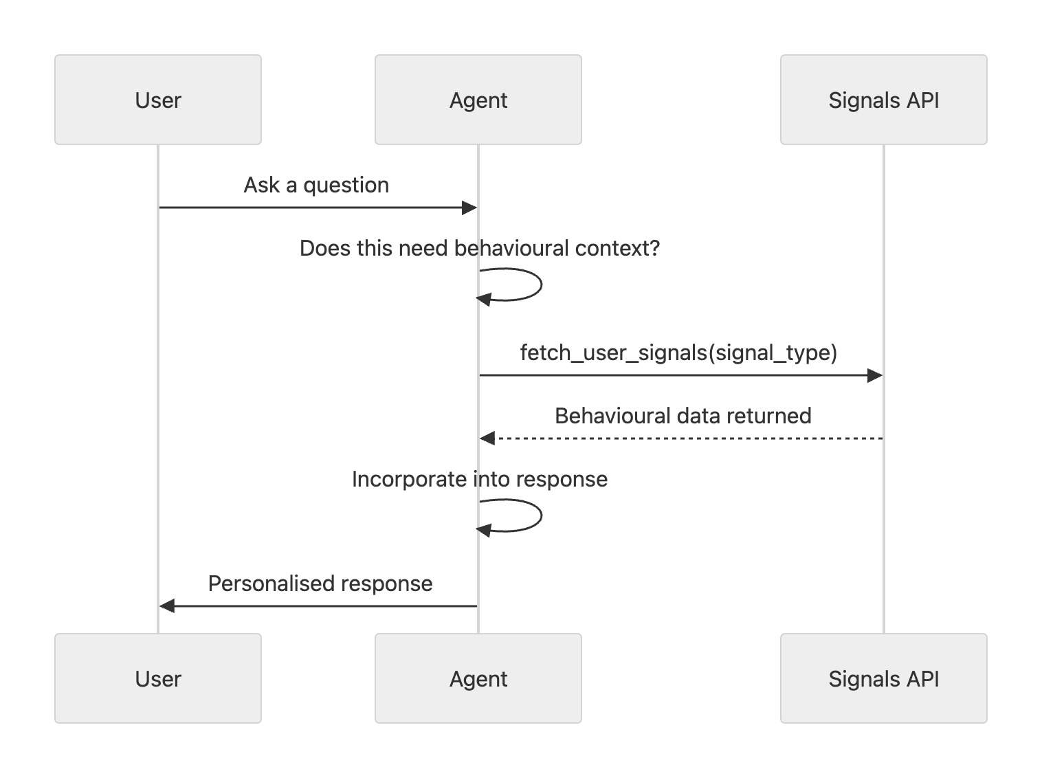 When to use it: Persistent agents used across multiple sessions; assistant-style agents that need to build up a model of the user over time. Note: you could achieve some of this by querying your data warehouse directly. The difference is Signals delivers pre-structured, real-time behavioral profiles, rather than raw event tables that require transformation before your agent can use them.