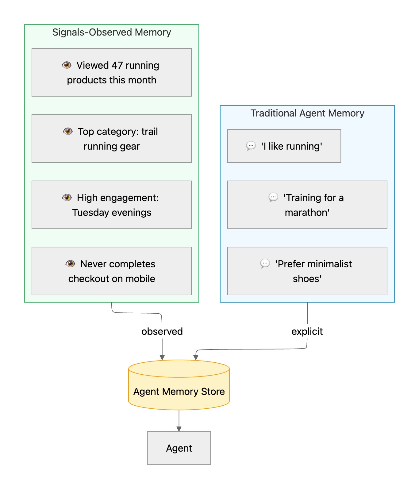 Traditional agent memory is built almost entirely from what the user has said — explicit statements made during previous interactions. "I like running." "I'm training for a marathon." "I prefer minimalist shoes." This is valuable, but it's incomplete: it captures declared preferences, not actual behavior, and it only reflects moments when the user chose to share something.